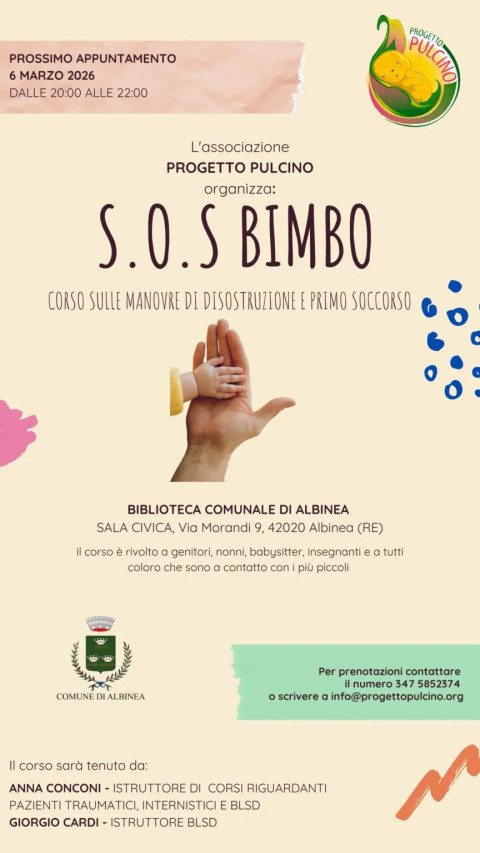 Venerdì 6 marzo 2026 a Albinea, dalle 20 alle 22, nella sala civica di via Morandi 9, si terrà “S.OS. Bimbo”: un corso sulle manovre di disostruzione e primo soccorso organizzato dall’associazione Progetto Pulcino.