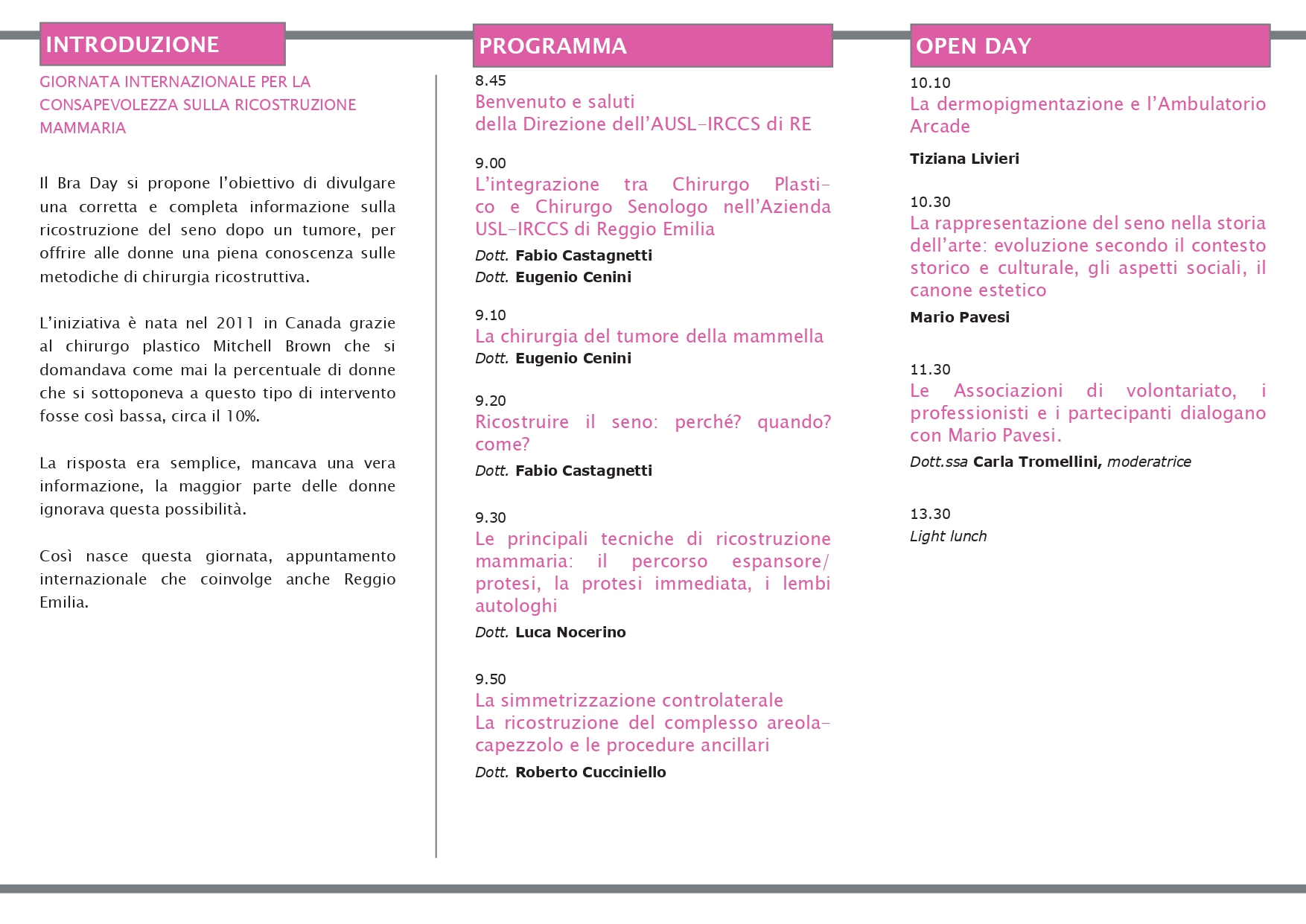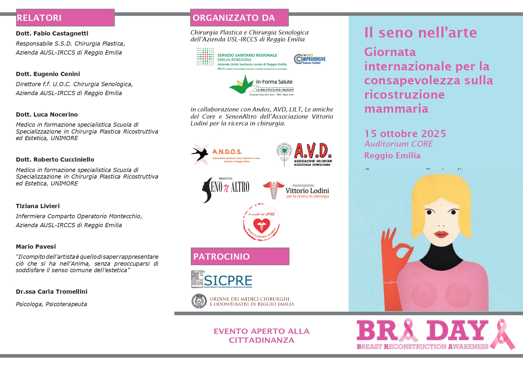 Quest’anno il format prevede una prima parte di relazioni dei medici sugli aspetti più clinico scientifici della ricostruzione mammaria seguita da una seconda parte gestita dall’artista reggiano Mario Pavesi che si confronterà con il pubblico, le associazioni e professionisti, riguardo “La rappresentazione del seno nella storia dell’arte: evoluzione secondo il contesto storico e culturale, gli aspetti sociali, il canone estetico”.