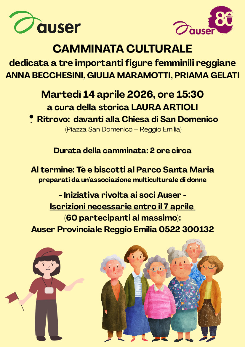 Martedì 14 aprile, Auser propone una camminata culturale pomeridiana insieme alla storica Laura Artioli nel quartiere Santa Croce di Reggio Emilia. La passeggiata sarà l’opportunità per scoprire la vita di tre emblematiche donne reggiane: Anna Becchesini, Giulia Fontanesi, Priama Gelati.