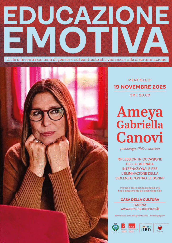Torna anche la rassegna Educazione Emotiva, nata nel 2022 e che negli anni si è strutturata come un percorso articolato, che ha visto il coinvolgimento di professionisti del settore psicologico, ma anche artisti, autori e figure del panorama culturale italiano. Mercoledì 19 novembre, alle ore 20.30, alla Casa della Cultura – Biblioteca di Casina, torna Ameya Gabriella Canovi, psicologa, PhD, autrice e divulgatrice tra le voci più autorevoli in Italia su relazioni e dipendenze affettive. Con il suo linguaggio diretto e profondamente umano, l’autrice guiderà il pubblico in un incontro di riflessione e ascolto condiviso. L’ingresso è gratuito e senza prenotazione, fino a esaurimento dei posti disponibili.
