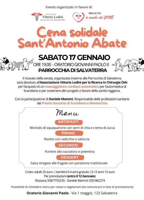Una sera a tavola a Salvaterra per potenziare la fornitura di materiale sanitario per l’automedica di Scandiano. La cena solidale di Sant’Antonio Abate si terrà sabato 17 gennaio, proprio in occasione della ricorrenza religiosa, all’oratorio parrocchiale Giovanni Paolo II in via I° Maggio 123 a Salvaterra di Casalgrande, organizzata dalla parrocchia in collaborazione con l’associazione Vittorio Lodini per la ricerca in chirurgia e il progetto Le amiche del Core.