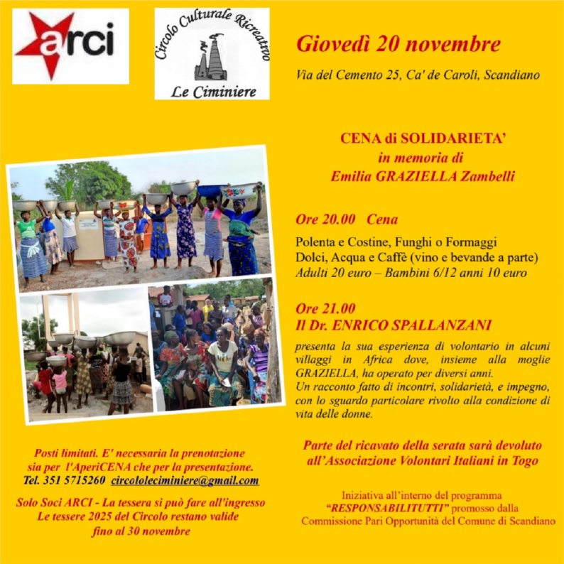 Una sera a cena per ricordare una grande volontaria e una bella storia solidale reggiana in Africa. Domani, giovedì 20 novembre, il circolo Arci Le Ciminiere in via del Cemento 25 a Ca’ de Caroli, di Scandiano si terrà una cena di solidarietà in memoria di Emilia Graziella Zambelli. Protagonista principale della serata sarà il dottor Enrico Spallanzani, dentista rubierese che per tanti anni ha operato in villaggi in Africa e in Sudamerica assieme alla moglie Graziella, scomparsa nel febbraio 2025.
