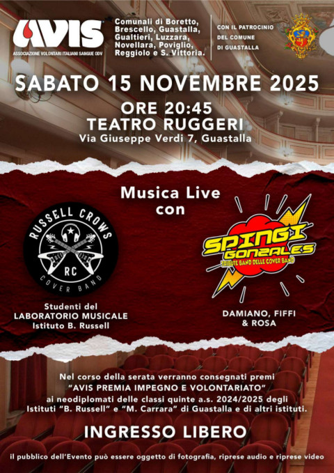 Le Avis della Bassa Reggiana ancora insieme per promuovere dono e volontariato tra i giovani. Sabato 15 novembre 2025, alle 20.45 il teatro comunale Ruggeri Guastalla ospiterà una serata di festa all’insegna del merito, della musica e del volontariato.