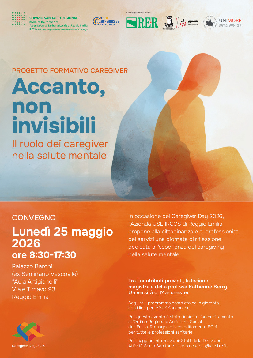 “Accanto, non invisibili. Il ruolo dei caregiver nella salute mentale”. È il tema, di grande attualità, del convegno in programma lunedì 25 maggio 2026 a Reggio Emilia, dalle 8.30 alle 17.30 all’aula Artigianelli di Palazzo Baroni (ex Seminario Vescovile), in viale Timavo 93.