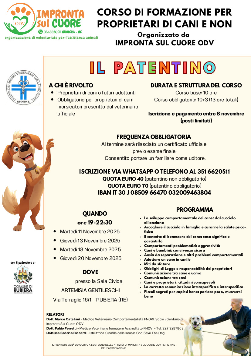 Un nuovo corso di formazione per proprietari di cani e persone interessate a diventarle. Promosso da Impronta sul Cuore Odv, organizzazione di volontariato per l’assistenza animali di Rubiera, si terrà a novembre, in 4 serate divise in 2 settimane. A ciclo conclusivo si riceverà un patentino certificato dall’associazione.