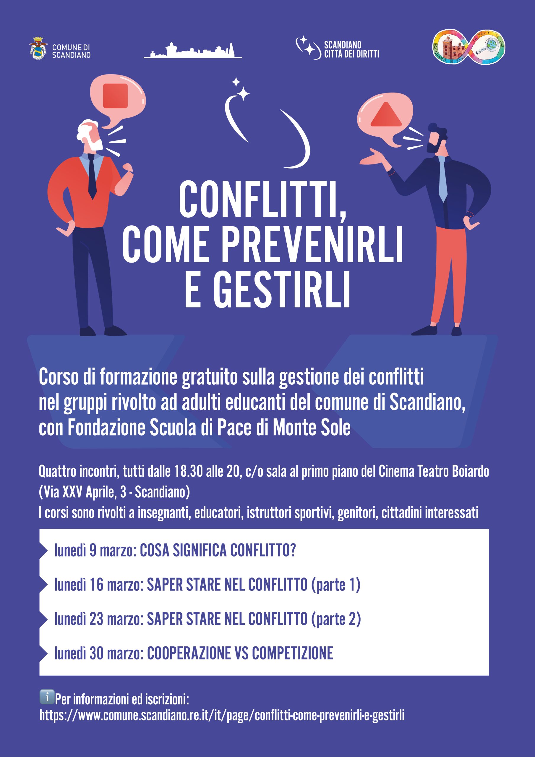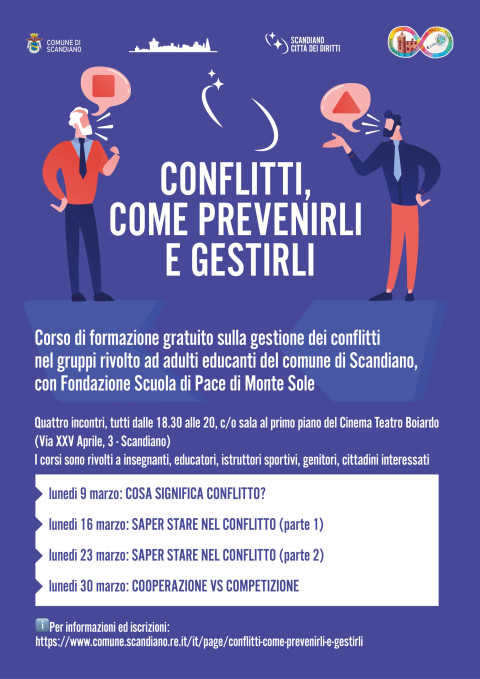 - A questo link si trova tutte le informazioni e il form per l’iscrizione: https://www.comune.scandiano.re.it/it/page/conflitti-come-prevenirli-e-gestirli