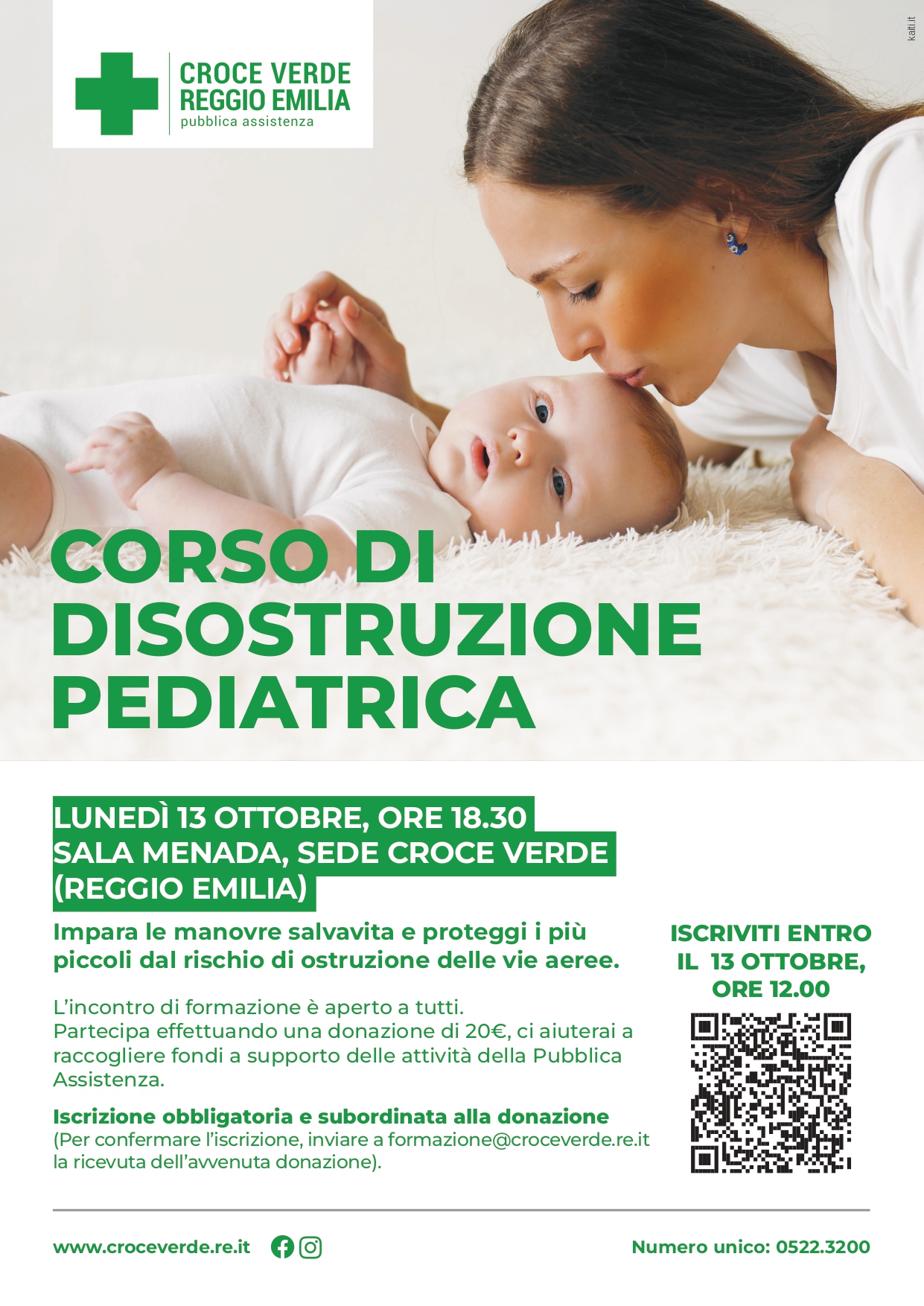 Prenderà il via lunedì 13 ottobre il nuovo corso di disostruzione pediatrica organizzato dalla Croce Verde di Reggio Emilia e Albinea. L’appuntamento sarà nella sala Menada, nella sede della Pubblica assistenza reggiana in via della Croce Verde 1, alle ore 18.30.