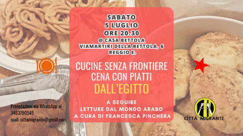 Tornano le serate gastronomiche interculturali promosse da Città Migrante. Il prossimo appuntamento è fissato alle 20 di sabato 5 luglio 2025 a Casa Bettola Casa Cantoniera Autogestita in via Martiri della Bettola 6 a Reggio Emilia per un momento con cibo dall’Egitto e letture dal mondo arabo.