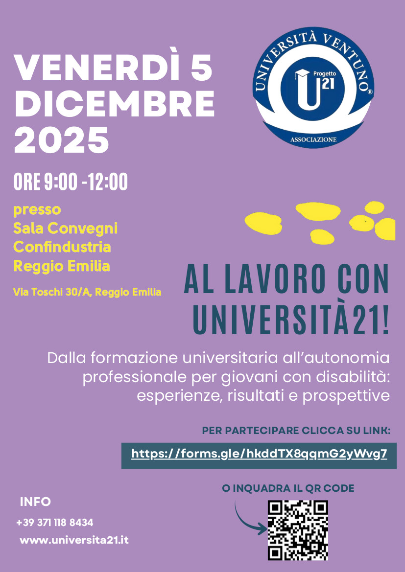 “Dalla formazione universitaria all’autonomia professionale per giovani con disabilità: esperienze, risultati e prospettive”. È un tema impegnativo quanto cruciale per i prossimi anni, quello al centro della prossima iniziativa proposta da Università 21, storica associazione reggiana, la prima in Italia a riuscire a garantire percorsi universitari adeguati alle caratteristiche di giovani con disabilità.
