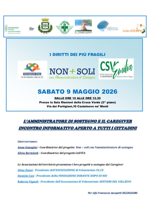 Si parla dei “Diritti dei più fragili” e dei progetti e delle realtà che quotidianamente si impegnano per tutelarli, nell’incontro pubblico informativo in programma nella mattinata di sabato 9 maggio a Castelnovo ne’ monti.