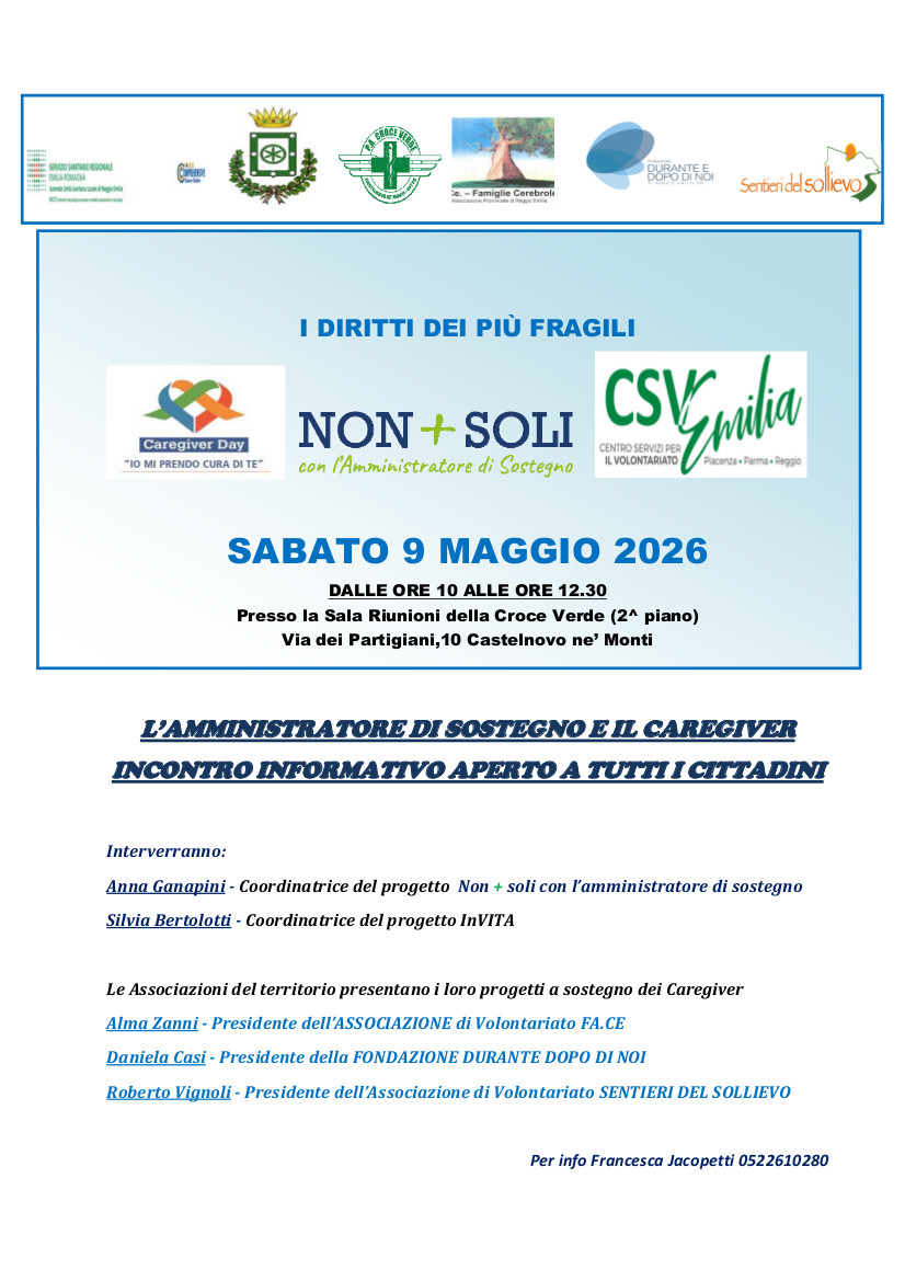 Si parlerà delle figure dell’amministratore di sostegno e del caregiver e in particolare dei due progetti sul tema coordinati da CSV Emilia.