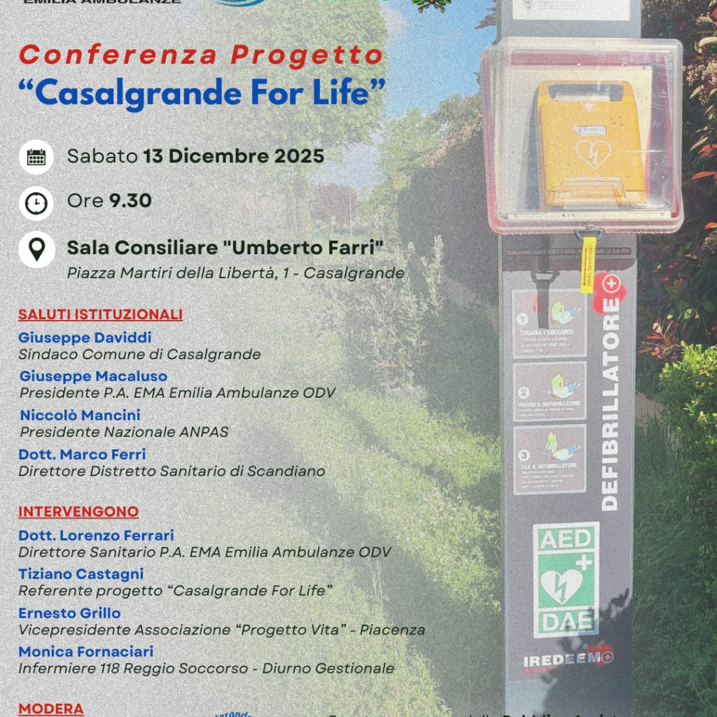 Sabato 13 dicembre alle 9.30 nella sala consiliare Umberto Farri del municipio di Casalgrande in piazza Martiri della Libertà, si terrà la conferenza riassuntiva del progetto “Casalgrande For Life”, evento al quale tutta la cittadinanza è invitata a partecipare, promossa dall’associazione col Comune di Casalgrande.