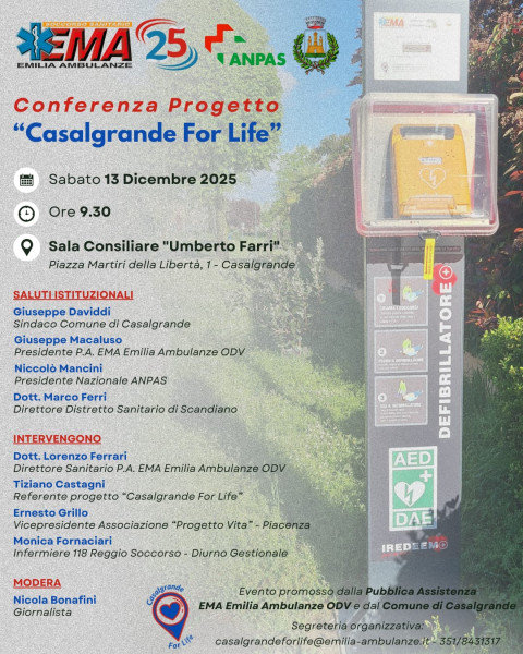 Per l’occasione sono stati invitati diversi professionisti e addetti ai lavori. Insieme al sindaco di Casalgrande Giuseppe Daviddi e al presidente di EMA Emilia Ambulanze Giuseppe Macaluso, interverranno il presidente nazionale di Anpas (’associazione che riunisce le pubbliche assistenze italiane) Niccolò Mancini e Marco Ferri, direttore del Distretto Sanitario di Scandiano.