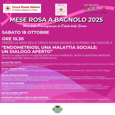 Sabato 18 ottobre alle ore 10.30, presso la sede Croce Rossa di Bagnolo in Piano (via Tassone 3), si terrà un incontro aperto alla cittadinanza dal titolo “Endometriosi, una malattia sociale: un dialogo aperto”, promosso da: Comune di Bagnolo, Croce Rossa e dalla campagna “Endometriosi: Firma adesso!” nell’ambito della rassegna “Ottobre Rosa” per la prevenzione e la salute della donna.