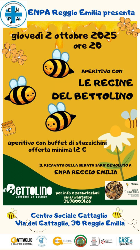 Giovedì 2 ottobre 2025, alle 20 al Centro Sociale Gattaglio in via del Gattaglio 30 a Reggio Emilia, si terrà l’iniziativa “Aperitivo con le Regine del Bettolino”, organizzata da ENPA Reggio Emilia.