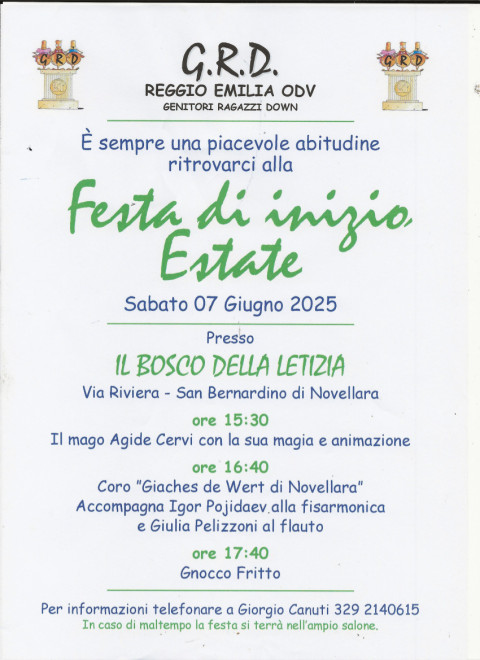 Tempo di ritrovo per l’associazione G.R.D. Reggio Emilia ODV – Genitori Ragazzi Down. L’appuntamento per la Festa di inizio Estate è per il pomeriggio di sabato 7 giugno nella bella area verde del Bosco della Letizia di via Riviera a San Bernardino di Novellara.