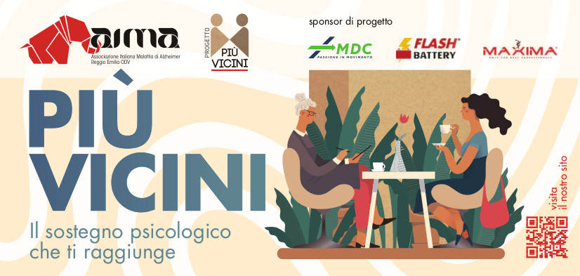 AIMA Reggio Emilia ODV ringrazia per la vicinanza chi ha permesso la prosecuzione del progetto “Più Vicini” nel 2025. Questo servizio essenziale, dedicato al sostegno delle persone con demenza e dei loro caregiver, potrà garantire la continuità delle proprie attività fondamentali grazie al sostegno rinnovato e vitale di tre partner insostituibili.