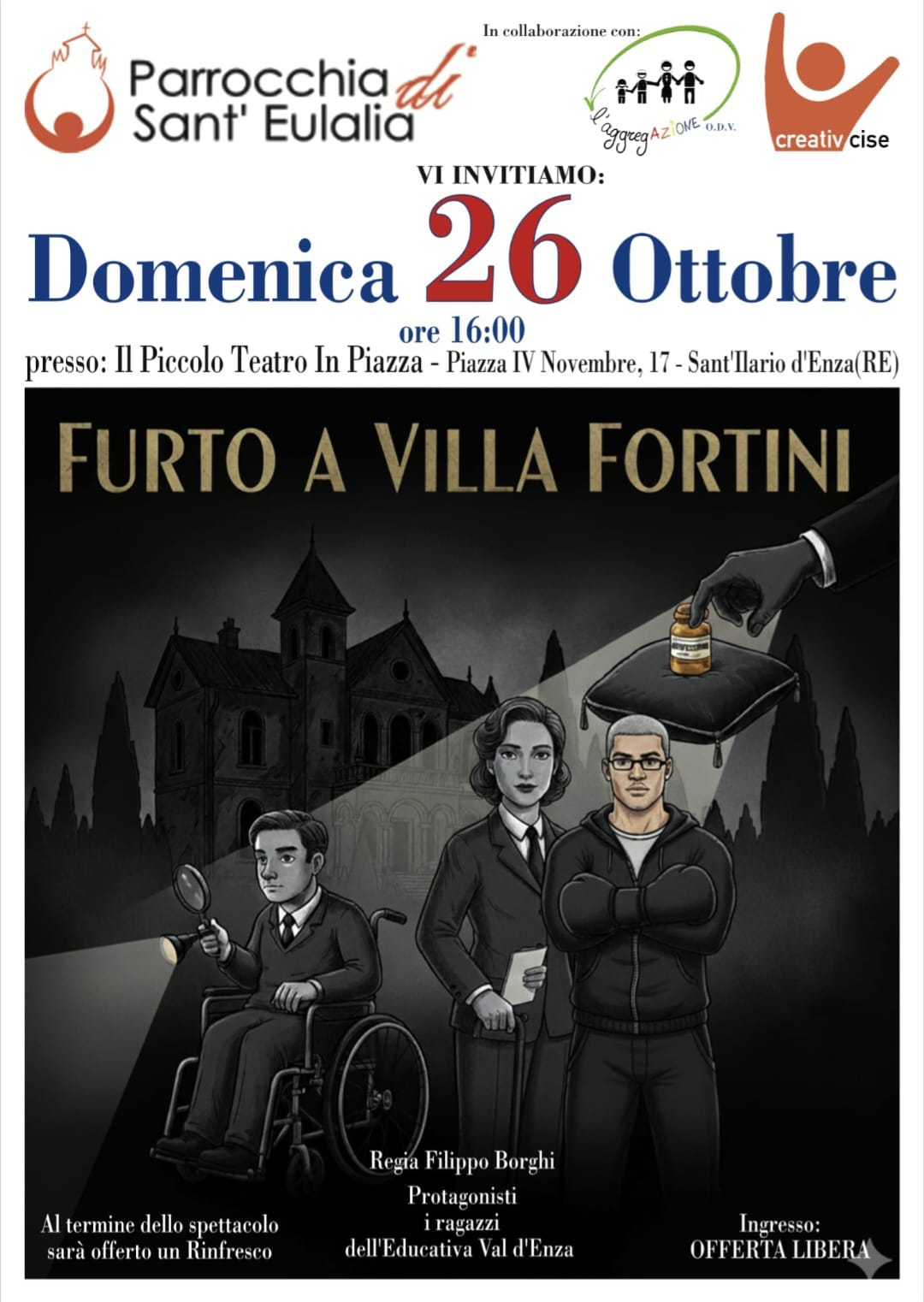 Uno spettacolo con i ragazzi disabili dell’Educativa Val d’Enza. “Furto a Villa Fortini” andrà in scena nel pomeriggio di domenica 26 ottobre al Piccolo Teatro in Piazza nel centro di Sant’Ilario d’Enza e sarà la prima occasione per conoscere lo spettacolo realizzato dal regista Filippo Borghi con i giovani disabili dell’Educativa del territorio.