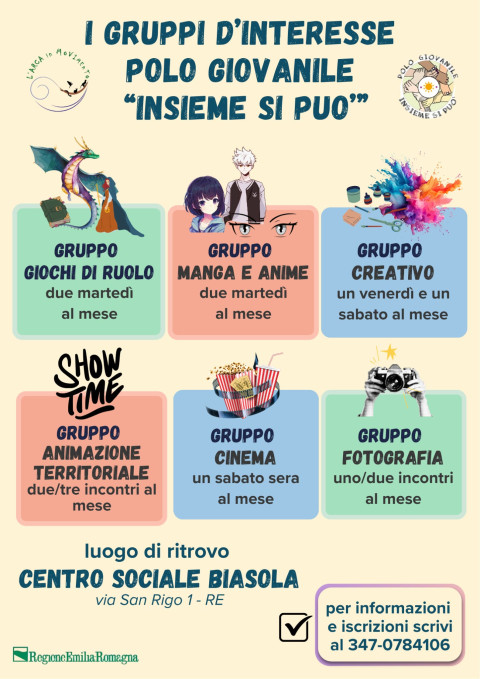 Giochi di ruolo, manga e anime. animazioni, cinema e fotografia. Sono i temi che i giovani utenti potranno approfondire grazie alla rassegna ospitata dal centro sociale Biasola di San Rigo di Reggio Emilia, che prevede diversi incontri su svariati argomenti, ospitati con cadenza regolare.