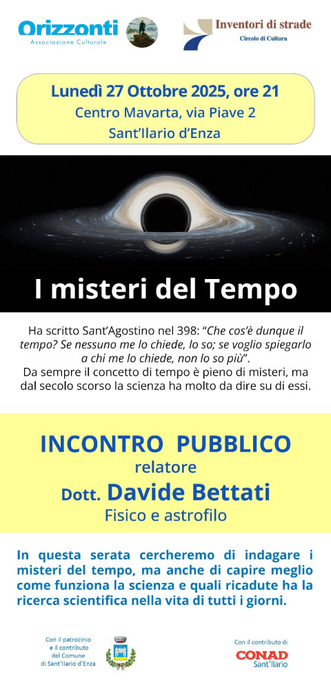 Lunedì 27 Ottobre 2025 alle 21 al centro culturale Mavarta in via Piave 8 a Sant’Ilario è in programma “I misteri del tempo”, incontro pubblico con Davide Bettati, fisico e astrofilo.
