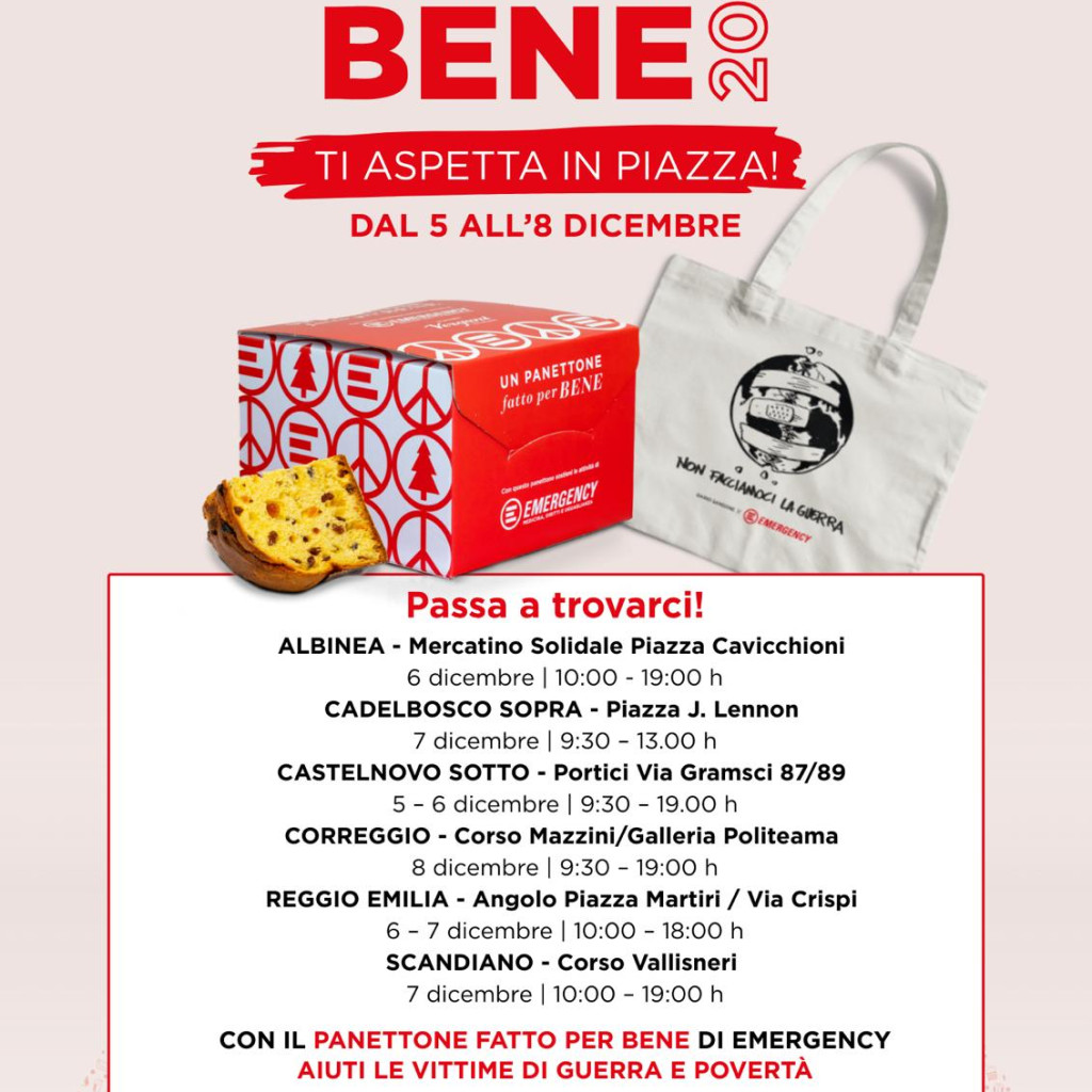 Tornano a Reggio Emilia i panettoni della pace di Emergency per sostenere le attività dell’associazione nelle zone di guerra.