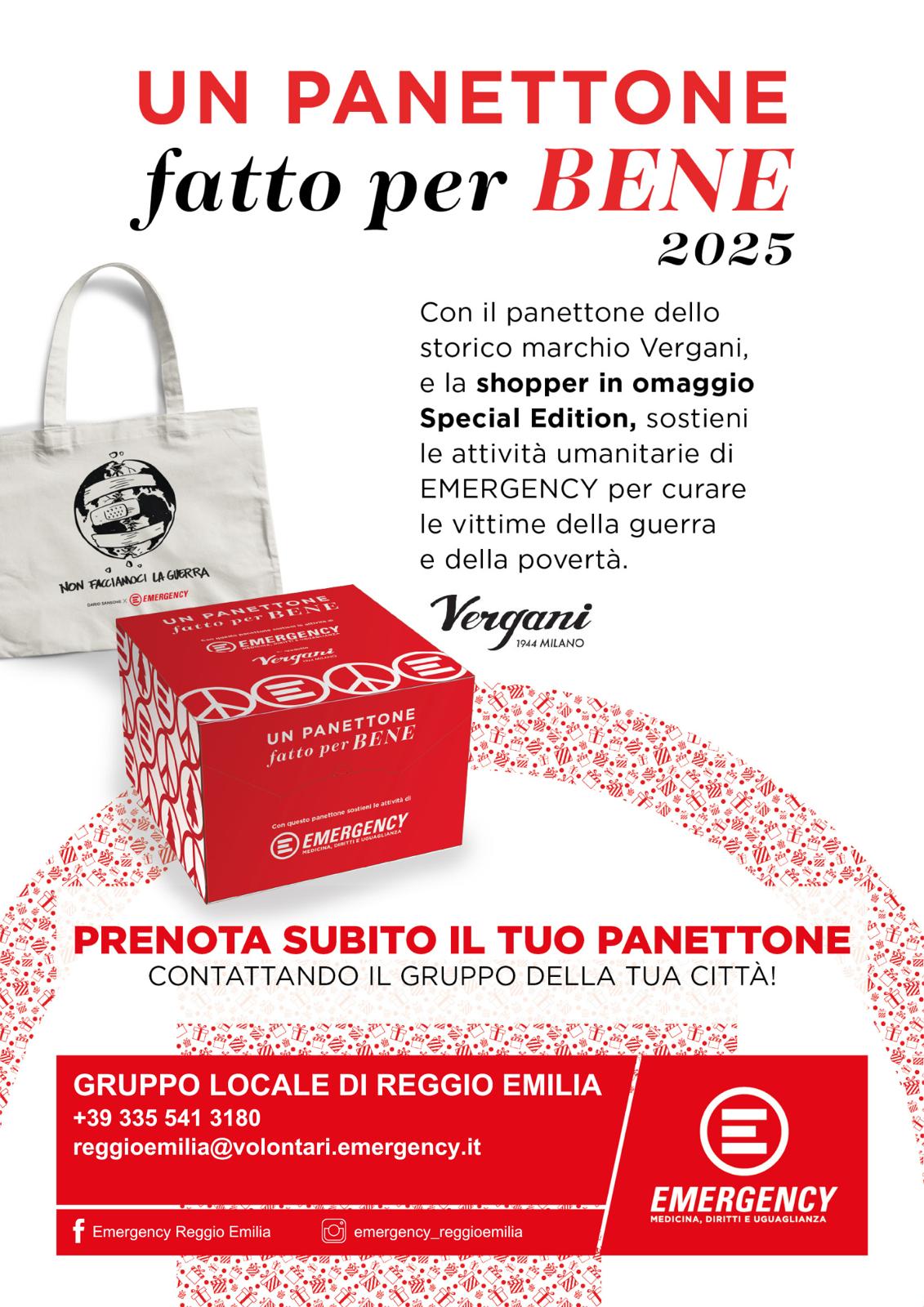 E’ possibile prenotare il panettone dello storico marchio Vergani, e la shopper in omaggio Special Edition, sostenendo così le attività umanitarie di Emergency per curare le vittime della guerra e della povertà.