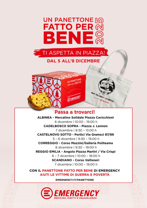 Tornano a Reggio Emilia i panettoni della pace di Emergency per sostenere le attività dell’associazione nelle zone di guerra.