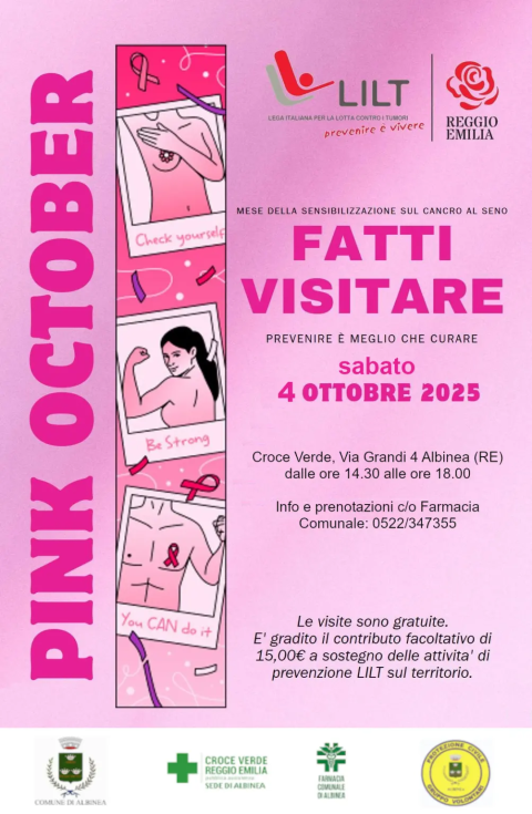 Il Comune di Albinea, insieme a Croce Verde, Protezione Civile e Farmacia Comunale, insieme alla LILT di Reggio Emilia, promuovono le visite gratuite nel corso del mese di ottobre.