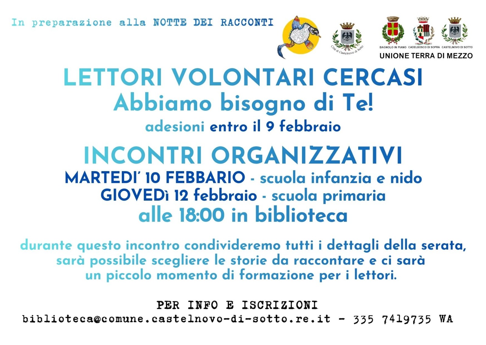 In vista della Notte dei Racconti 2026, in programma venerdì 20 febbraio, il Comune di Castelnovo di Sotto, insieme alla biblioteca comunale, apre la ricerca di volontari disponibili a leggere e raccontare storie durante la serata.