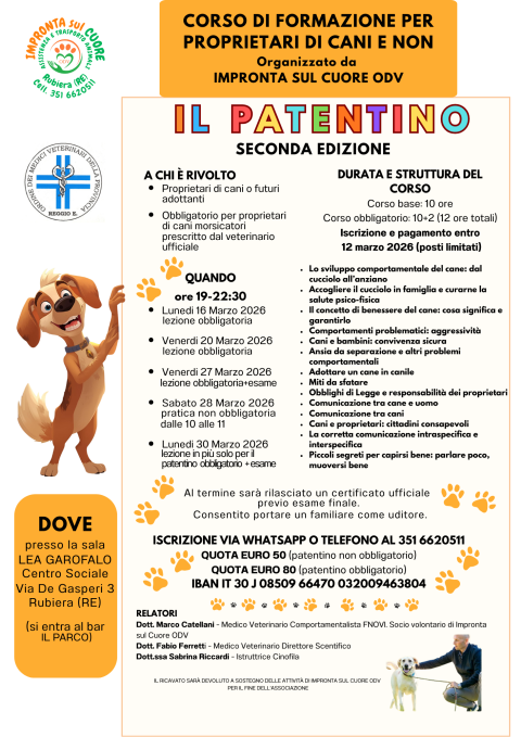 Un nuovo corso di formazione per proprietari di cani e persone interessate a diventarle. Promosso da Impronta sul Cuore Odv, organizzazione di volontariato per il trasporto e l’assistenza animali di Rubiera, si terrà nel marzo 2026, in cinque momenti divisi in due settimane. A ciclo conclusivo si riceverà un patentino certificato dall’associazione.