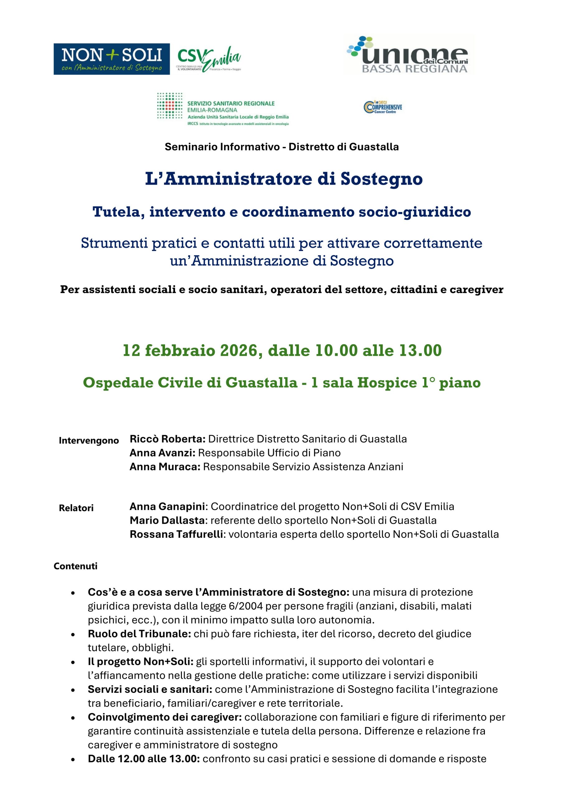 L’Amministratore di Sostegno si presenta a Guastalla. Giovedì 12 febbraio all’Ospedale Civile di Guastalla è in programma “L’Amministratore di Sostegno tutela, intervento e coordinamento sociogiuridico”, un seminario informativo sull’Amministratore di Sostegno e il nostro progetto Non+Soli rivolto al territorio del distretto guastallese.