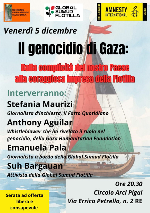 L’appuntamento è alle 20.30 al circolo Arci Pigal di via Petrella 2 a Reggio Emilia, per un evento organizzato dal comitato Free Assange di Reggio Emilia, da Amnesty International e da Global Sumud Flotilla. L’ingresso è con offerta libera e consapevole.