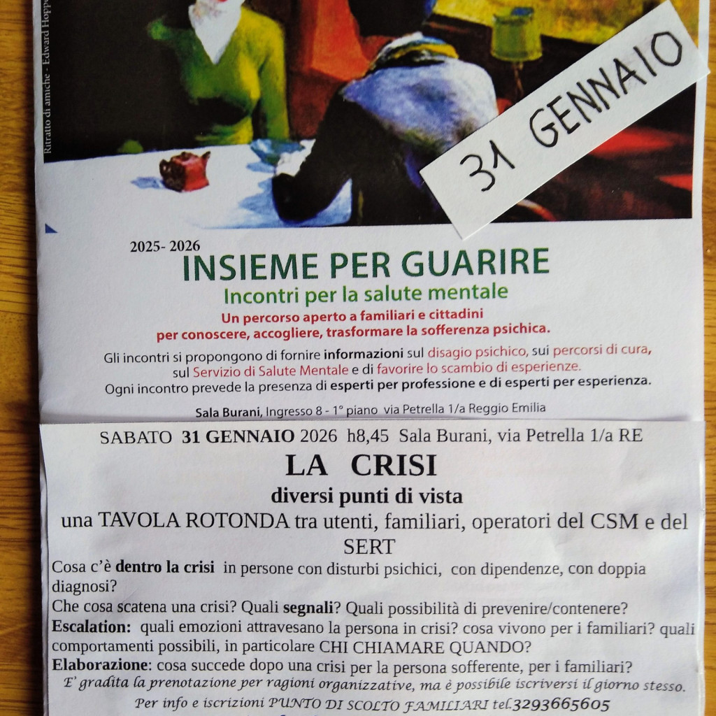 Torna nella stagione fredda 2025/26 a Reggio Emilia “Insieme per guarire”, il percorso aperto a familiari e cittadini per conoscere, accogliere, trasformare la sofferenza psichica promosso dall’Ausl reggiana e le associazioni Sentiero Facile e Sostegno e Zucchero con la collaborazione di CSV Emilia e Comune di Reggio Emilia.