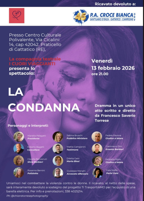 Si parla di violenza di genere ne “La condanna” lo spettacolo che la compagnia teatrale I Cuori Viaggianti porterà in scena venerdì 13 febbraio a Praticello di Gattatico, alle 21 all’interno Centro Culturale Polivalente di via Cicalini 14.