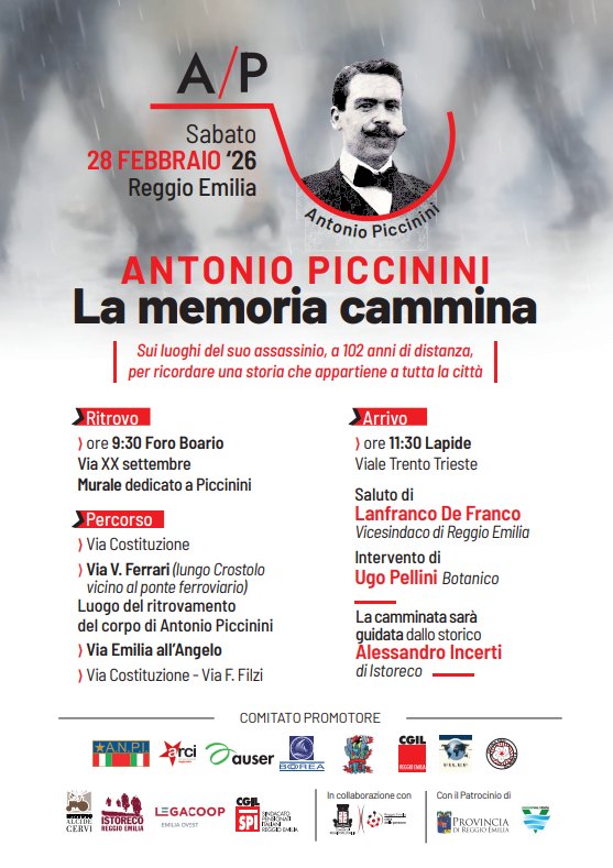 Sabato 28 febbraio, in occasione del 102° anniversario dell’uccisione di Antonio Piccinini, il Comitato promotore delle celebrazioni –formato da Anpi, Arci, Auser, Boorea, Cgil, Cucine del Popolo, Filef, Circolo Arci Gardenia, Istituto Cervi, Istoreco, Lega Coop Emilia Ovest, Spi-Cgil– organizza l’iniziativa pubblica “La memoria cammina”. Si tratta di una commemorazione itinerante e guidata che ripercorrerà i luoghi e la vita del sindacalista, cooperatore e politico reggiano assassinato il 28 febbraio 1924 dai fascisti.
