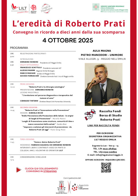 Lilt Reggio Emilia ricorda Roberto Prati a dieci anni dalla sua scomparsa. Per vent’anni primario di Chirurgia, a lungo presidente della Lilt reggiana, è morto nel 2015 e oggi l’associazione lo vuole ricordare con una giornata di studi.