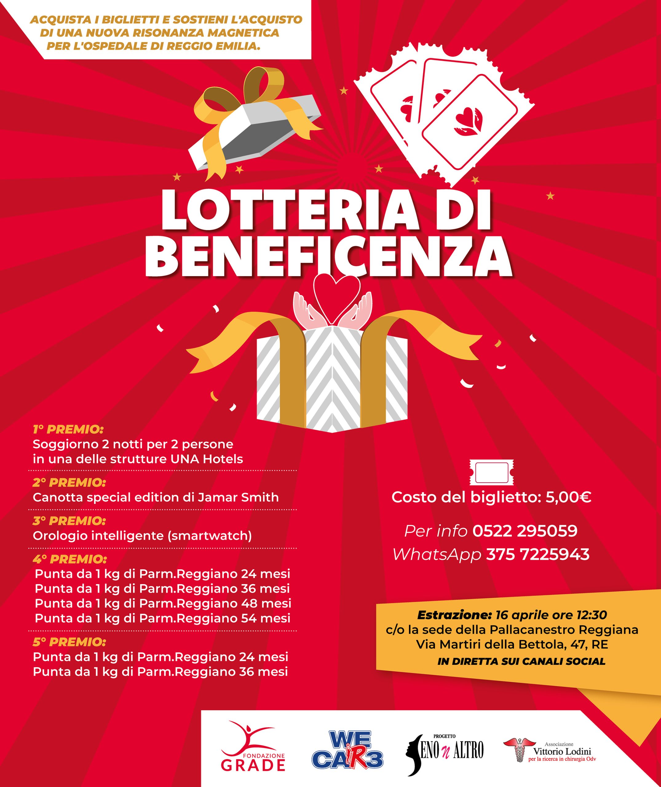 Un gesto semplice che può tradursi in un grande investimento per la salute di tutta la comunità. È questo lo spirito della nuova lotteria di beneficenza promossa dalla Fondazione Grade Onlus insieme a Senonaltro – Associazione Vittorio Lodini, all’interno del progetto We CaRE di Pallacanestro Reggiana.