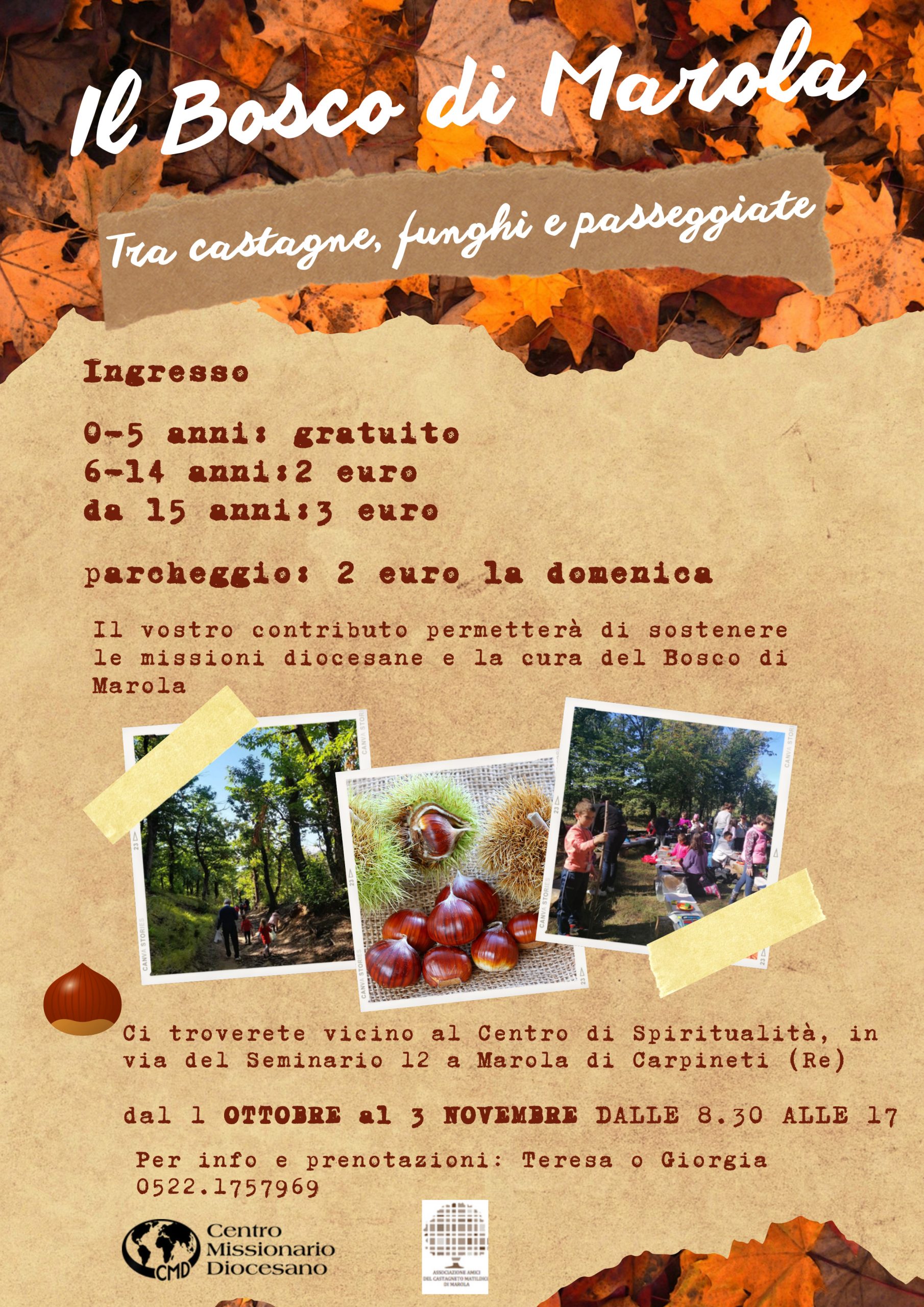 In calendario vi è la possibilità, per tutti i giorni del mese, di raccogliere le castagne nel bosco. L’ingresso costa 2 euro per bimbi dai 6 ai 14 anni, 3 euro dai 14 anni in su. Il parcheggio costa 2 euro, i bimbi fino ai 3 anni non devono versare alcun contributo. L’appuntamento è per ogni giornata dal 1 ottobre al 3 novembre dalle 8.30 alle 17 a fianco del centro di spiritualità dell’abbazia di Marola. Il ricavato servirà per sostenere le attività missionarie diocesane e la cura del bosco di Marola.