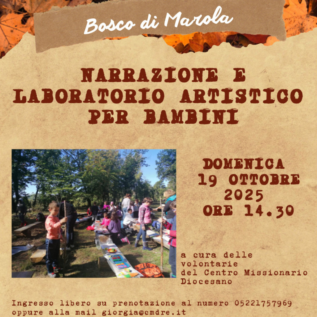 Inoltre, domenica 19 ottobre verrà proposto un laboratorio musicale e artistico per bambini, a ingresso libero. L’appuntamento è alle 14.30 all’ingresso del bosco. In caso di maltempo, l’evento è annullato. Per informazioni e prenotazioni, contattare Giorgia al numero 0522 1757969 o scrivere alla mail giorgia@cddre.it.