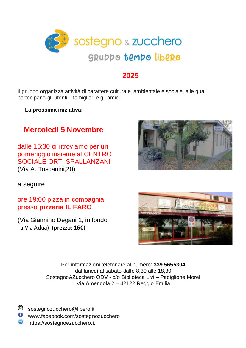 La prossima iniziativa si terrà mercoledì 5 novembre. Il ritrovo è fissato alle 15.30 a centro sociale Orti Spallanzani in via Toscanini 20 a Reggio Emilia, per un pomeriggio insieme.