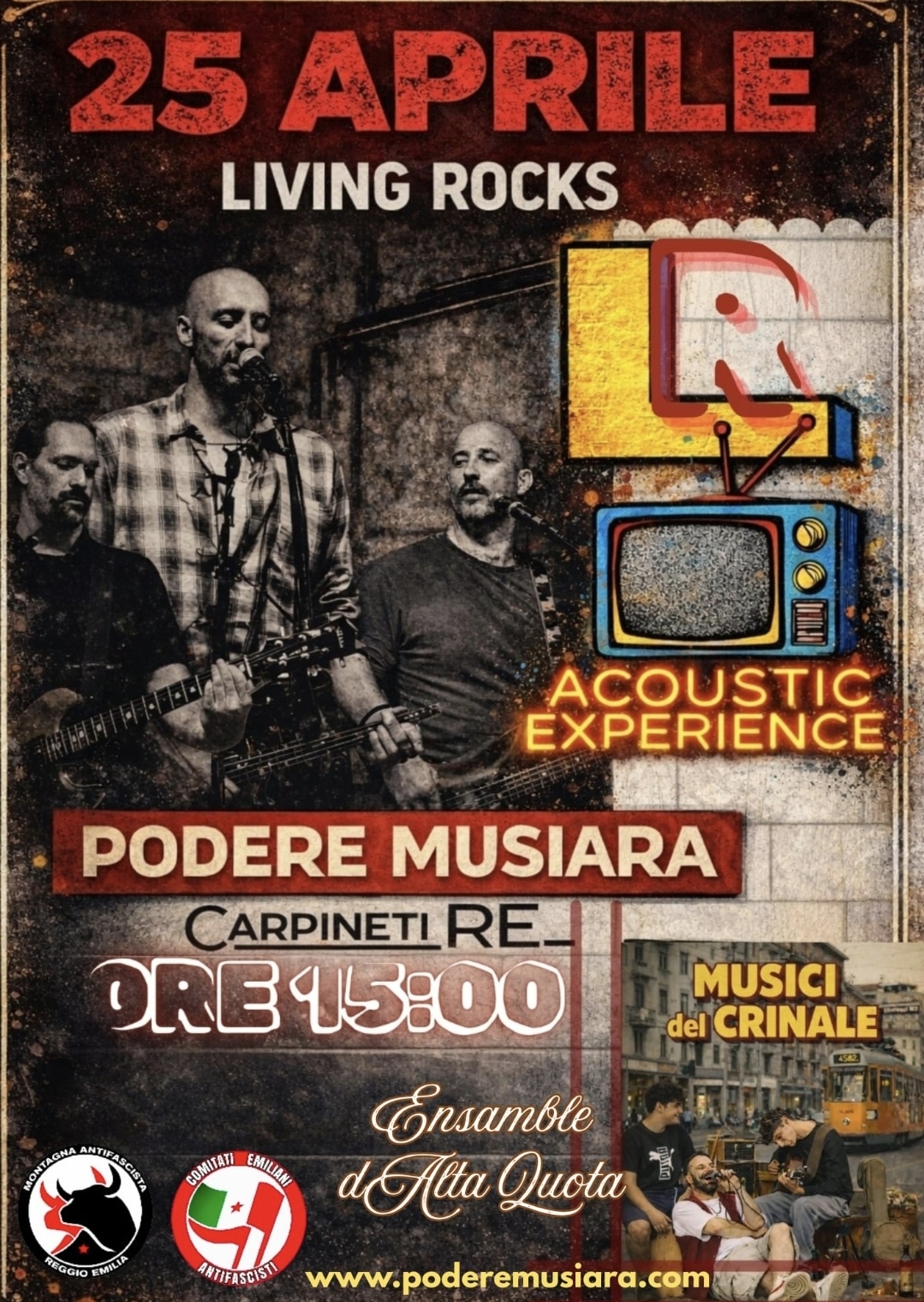- Living Rock, che nella loro Acoustic Experience portano sul palco una dimensione intima e raffinata del rock. Un viaggio acustico che attraversa i grandi classici dagli anni ’70 ai primi 2000, con particolare attenzione alle sonorità degli anni ’90 e ai brani italiani reinterpretati in chiave moderna. Un live autentico, caldo e coinvolgente, dove ogni canzone trova nuova vita tra arrangiamenti personali e armonie delicate.