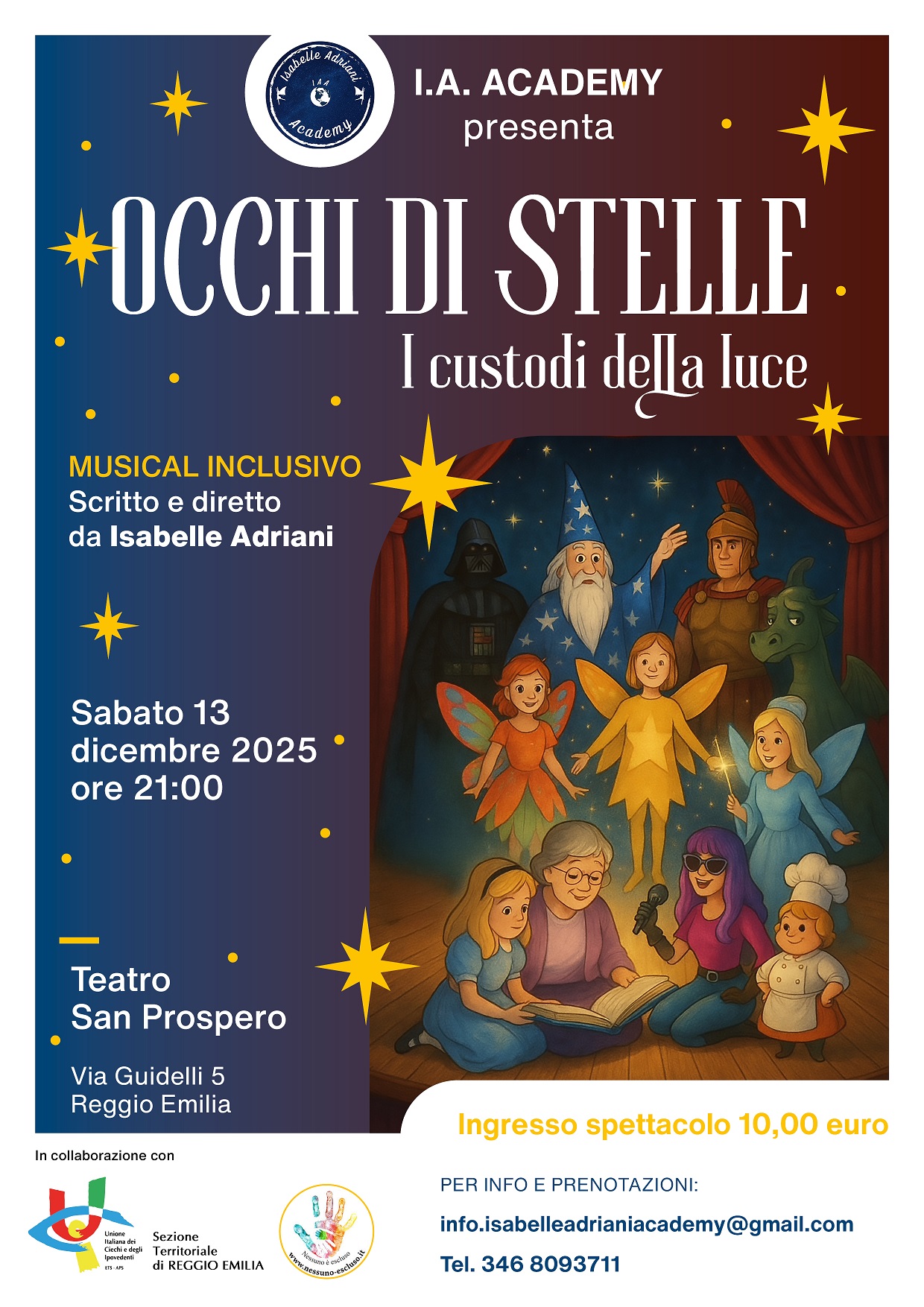Sabato 13 dicembre, celebrando la giornata dedicata a Santa Lucia, protettrice della vista, l’Associazione I.A. Academy, in collaborazione con l’Unione Italiana dei Ciechi e degli Ipovedenti ETS – APS Sezione Territoriale di Reggio Emilia e con l’associazione Nessuno è Escluso, è lieta di presentare il musical inclusivo “Occhi di stelle: i custodi della luce”, scritto e diretto da Isabelle Adriani.