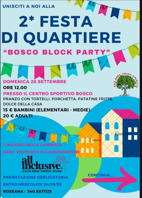 - il pranzo di quartiere con tortelli e porchetta per salutare l’estate tutti insieme. Il pranzo inizia alle 12, allestito nel centro sportivo di Bosco, il menù prevede tortelli, porchetta, patatine fritte e dolce della casa. Il costo è di 20 euro per gli adulti, di 15 euro per i giovani sino agli studenti delle scuole medie. Il ricavato della giornata verrà devoluto a All Inclusive Sport, il nostro progetto provinciale di inclusione della disabilità tramite la pratica sportiva che affianca ogni anno oltre 250 famiglie. La prenotazione è obbligatoria, da confermare a Rossana al numero 340 8871125.