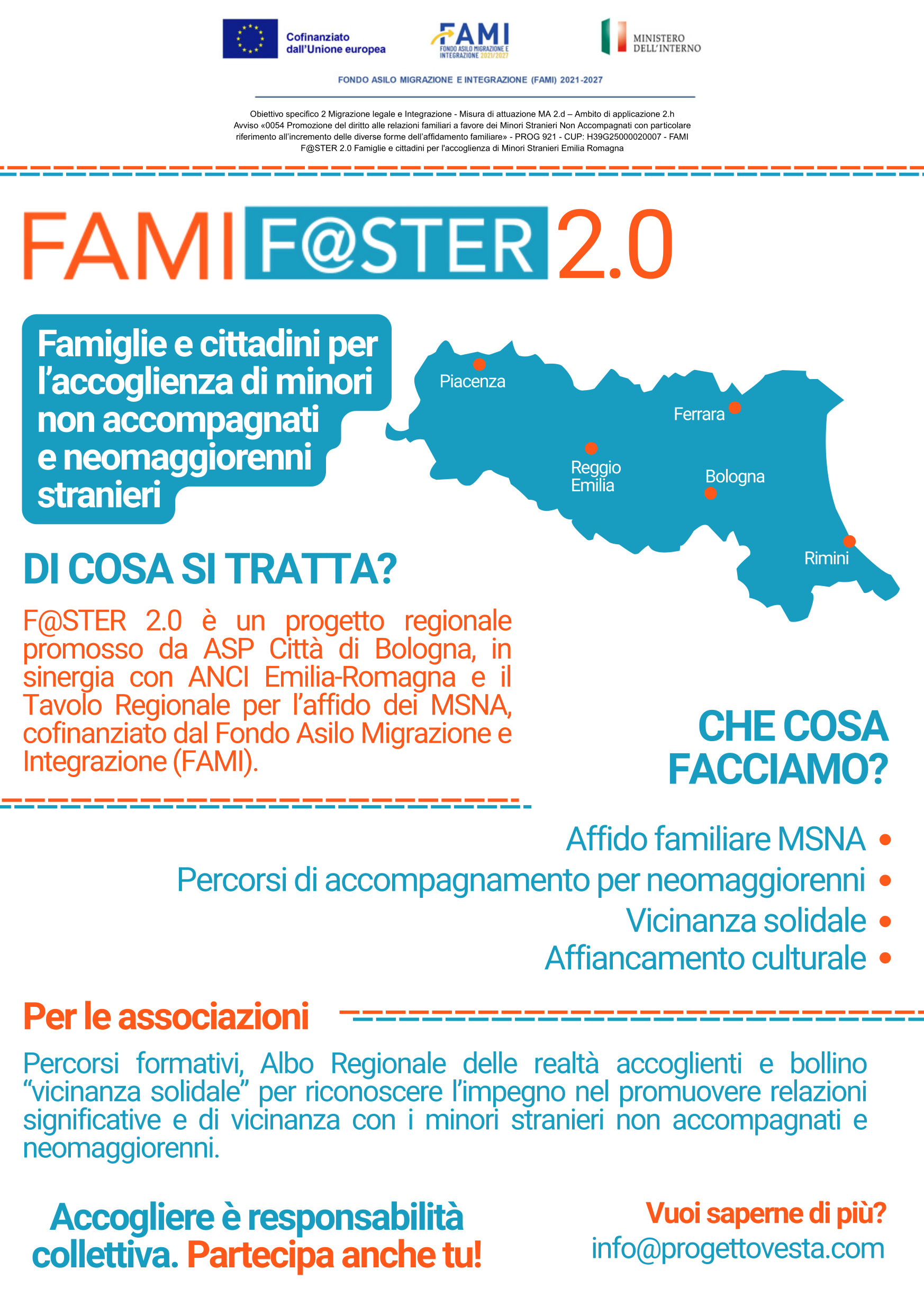 Il progetto FAMI F@STER 2.0 si presenta. È un’iniziativa regionale promossa in collaborazione con ANCI Emilia-Romagna e il Tavolo regionale per l’affido dei MSNA e cofinanziata dal Fondo Asilo Migrazione e Integrazione.