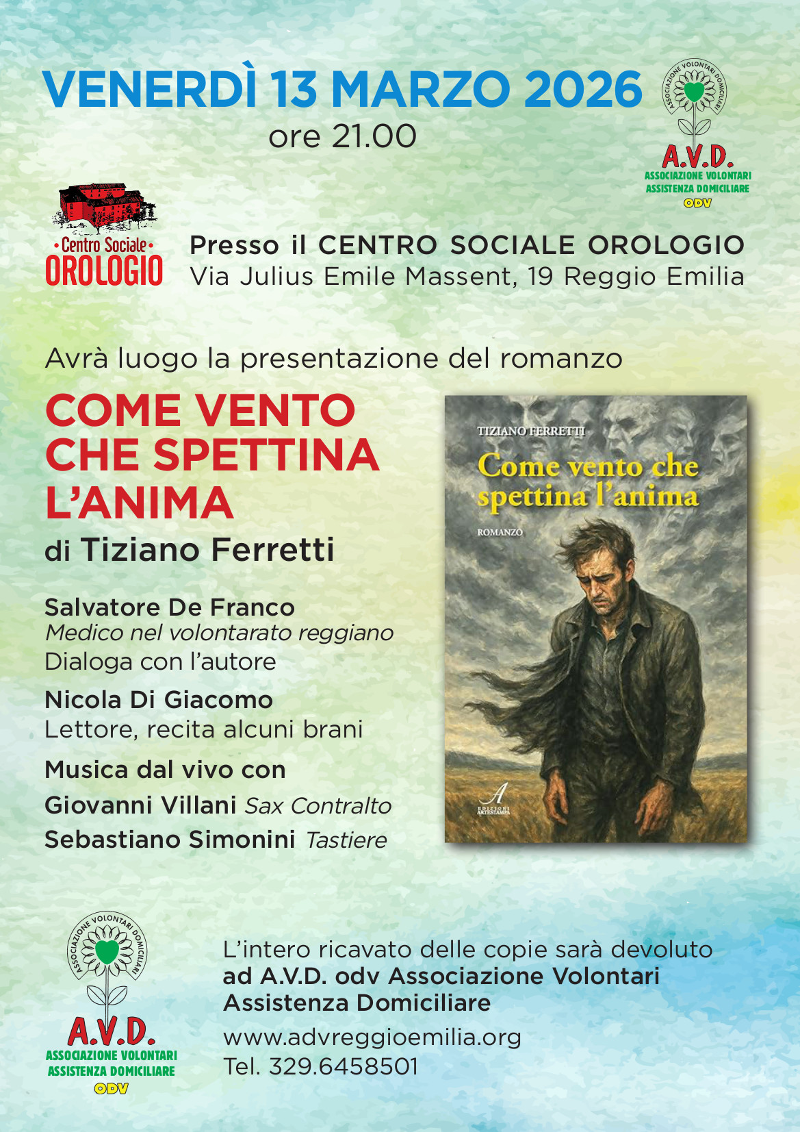 Una serata di letteratura per sostenere AVD – Associazione Volontari Assistenza Domiciliare Reggio Emilia. Venerdì 13 marzo, alle 21 al centro sociale Orologio in via Massenet 19 a Reggio Emilia, si terrà la presentazione del romanzo “Come vento che spettina l’anima” dell’autore reggiano Tiziano Ferretti.