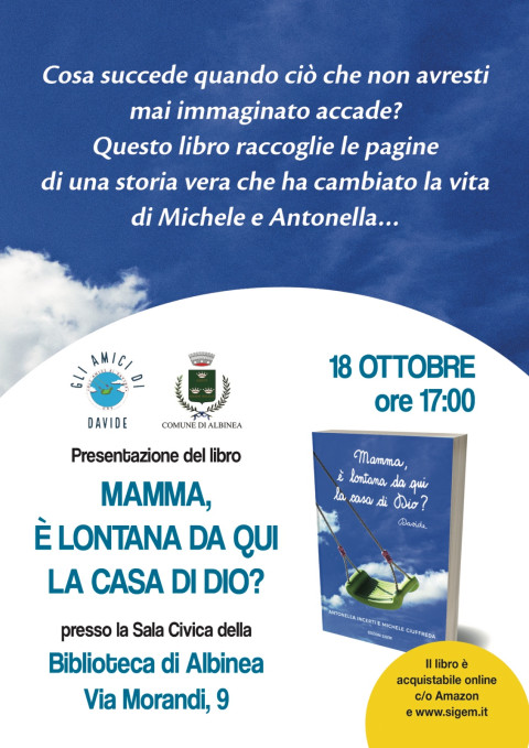 L’iniziativa, promossa dall’associazione Amici di Davide con il patrocinio del Comune di Albinea, si terrà alle 17 nella biblioteca comunale albinetana in via Morandi 9 e vedrà come momento principale la presentazione del volume “Mamma, è lontana da qui la casa di Dio? Davide” scritto da Antonella Incerti e Michele Ciuffreda.