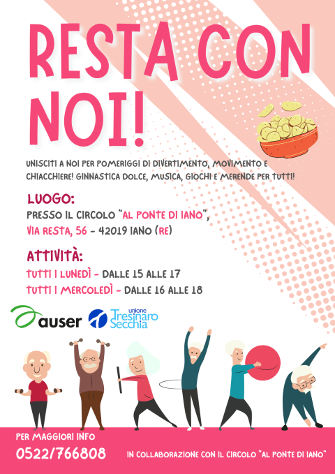 Riparte il filos di Auser Scandiano ospitato dal circolo Ponte di Iano, due pomeriggi settimanali da passare tra divertimento, movimento e chiacchiere, con ginnastica dolce, musica, giochi e merende per tutti.