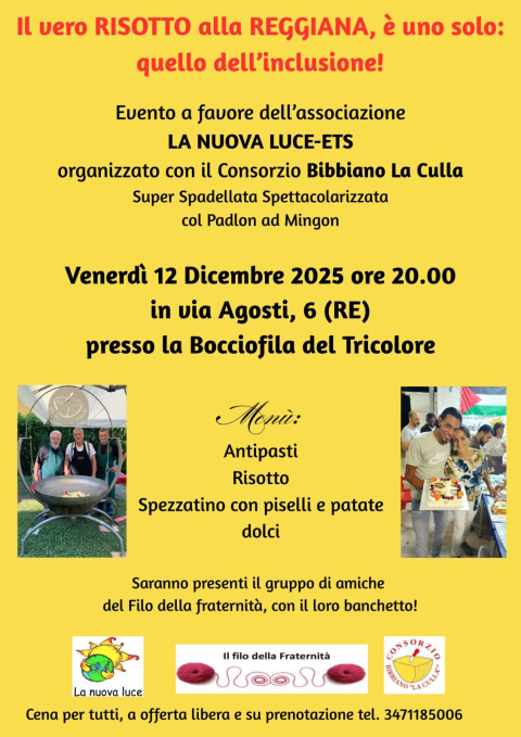 Venerdì 12 dicembre è in programma una cena solidale a favore dell’associazione La Nuova Luce, tra le principali realtà impegnate nel sostegno alle persone senza fissa dimora. L’evento è organizzato con il Consorzio Bibbiano La Culla e la Super Spadellata Spettacolarizzata col Padlon ad Mingon e vedrà al centro una classica ricetta nostrana, quella del risotto alla reggiana nel pentolone.