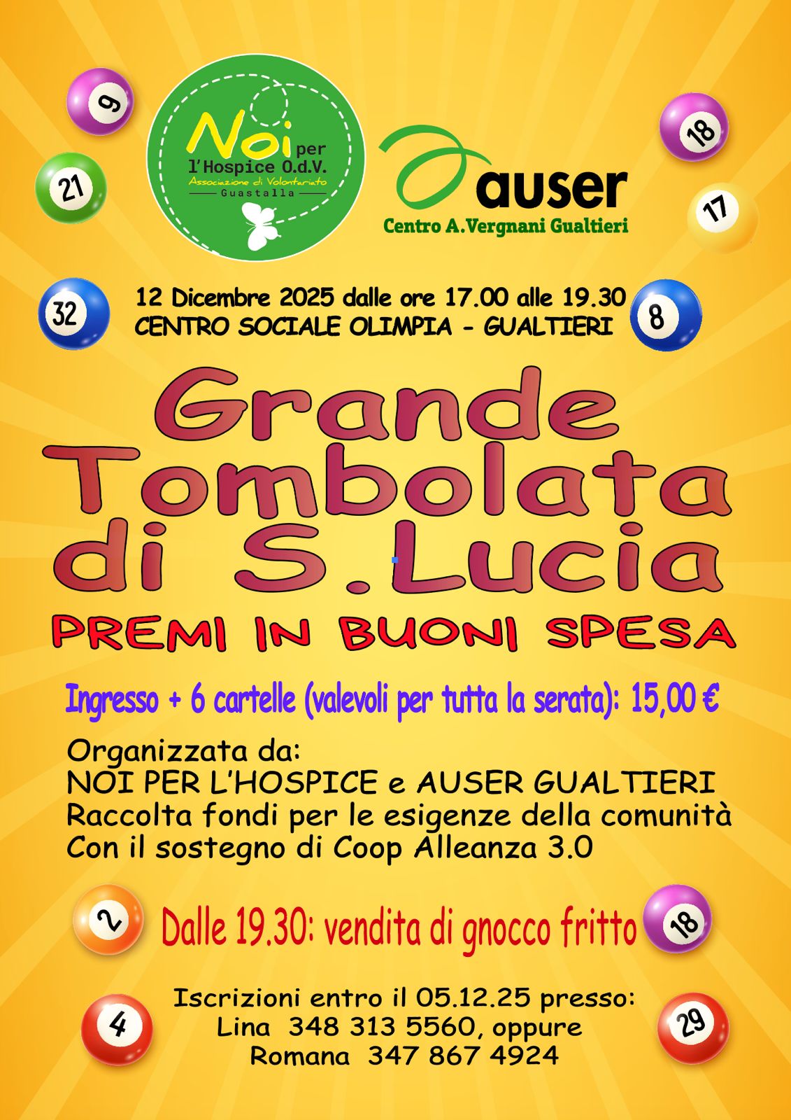 La Grande Tombolata di Santa Lucia si terrà venerdì 12 dicembre dalle 17 alle 19.30 al Centro Sociale Olimpia di Gualtieri. A seguire, dalle 19.30, ci sarà vendita di gnocco fritto. È promossa dall’associazione Noi per l’Hospice di Guastalla e dal Centro Auser “A. Vergnani” di Gualtieri con il sostegno di Coop Alleanza 3.0,