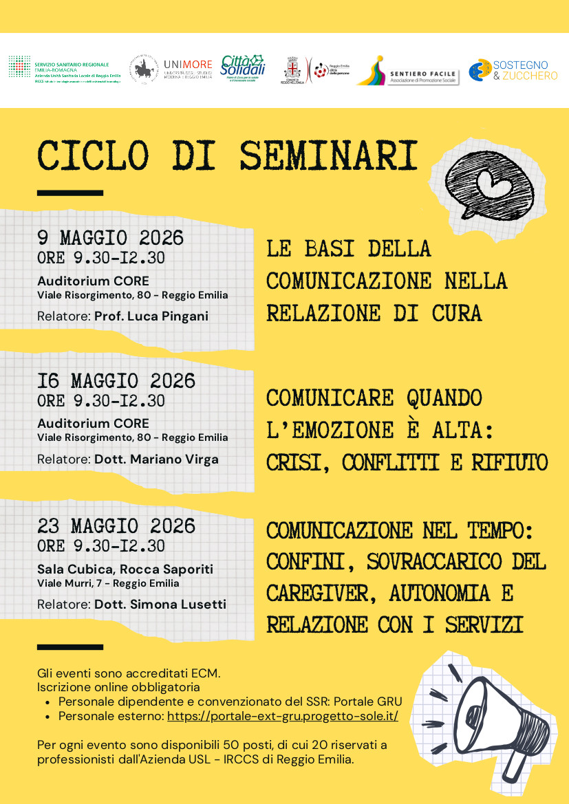 - 23 maggio 2026 ore 9.30-12.30 Sala Cubica, Rocca Saporiti Viale Murri, 7 – Reggio Emilia Relatore: Dott. Simona Lusetti – “Comunicazione nel tempo: confini, sovraccarico del caregiver, autonomia e relazione con i servizi”